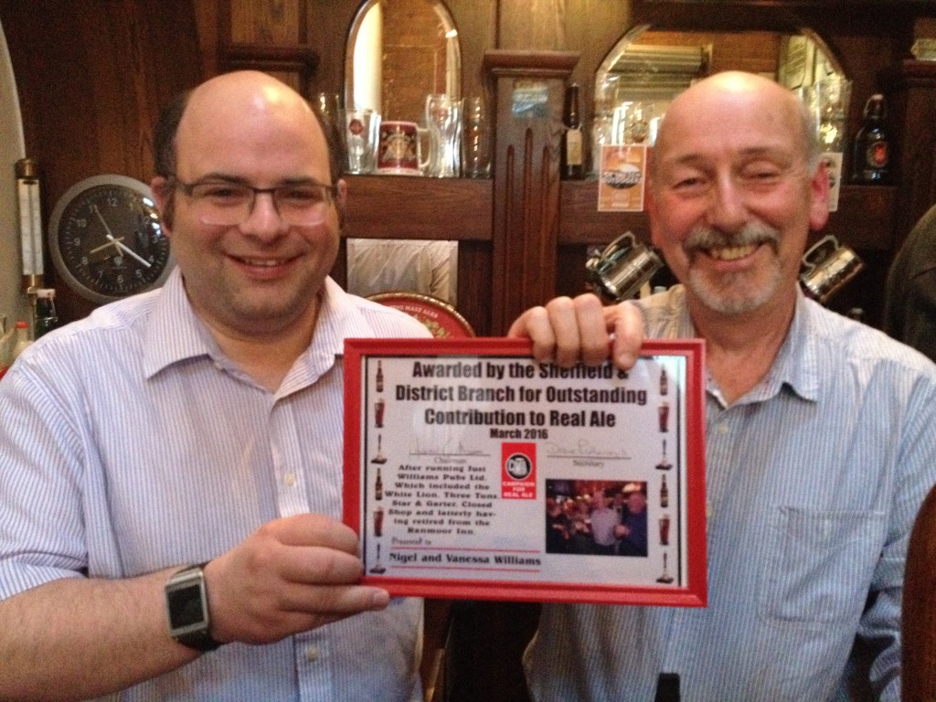 The latest of these awards presented (after a little delay!) was to Nigel Williams, who retired from the pub trade as licencee of the Ranmoor Inn. Previously he ran a group of iconic Sheffield pubs including the Three Tuns, White Lion and others under the ‘Just William’ pub company, all of which were successful real ale pubs under his watch. During this time he also headed the Licenced Victuallers Association in our area, an organisation designed to represent the interests of self employed licencees.