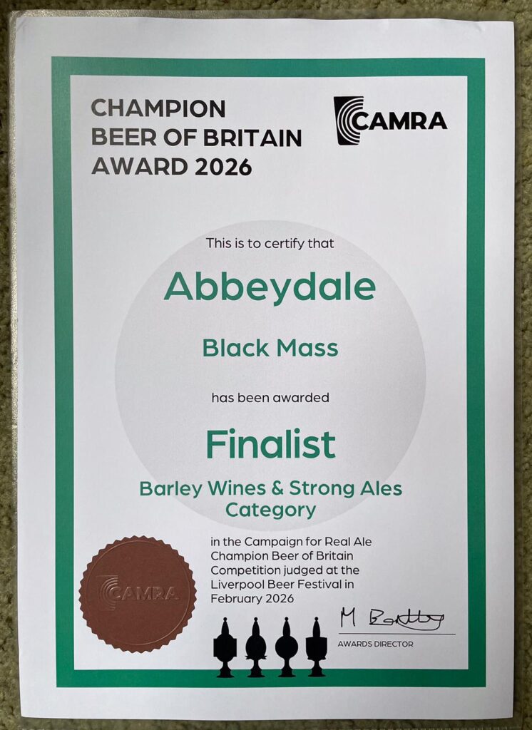 Abbeydale Brewery‘s Black Mass (a black IPA at 6.66% ABV) made it as a finalist in the “Barley Wines & Strong Ales” category of the Champion Beer of Britain awards. The winter ales categories were judged at Liverpool beer festival.