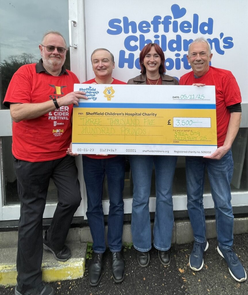 During the next month, look out for the Children’s Hospital Christmas displays which formally thank: ‘Sheffield CAMRA Steel City Beer Festival 2025.’ There will be snowflakes at both the Children’s Hospital and City Hall with snowflake tags at Ryegate (Paediatric Neuro-disabilities) and Becton (Paediatric Mental Health).