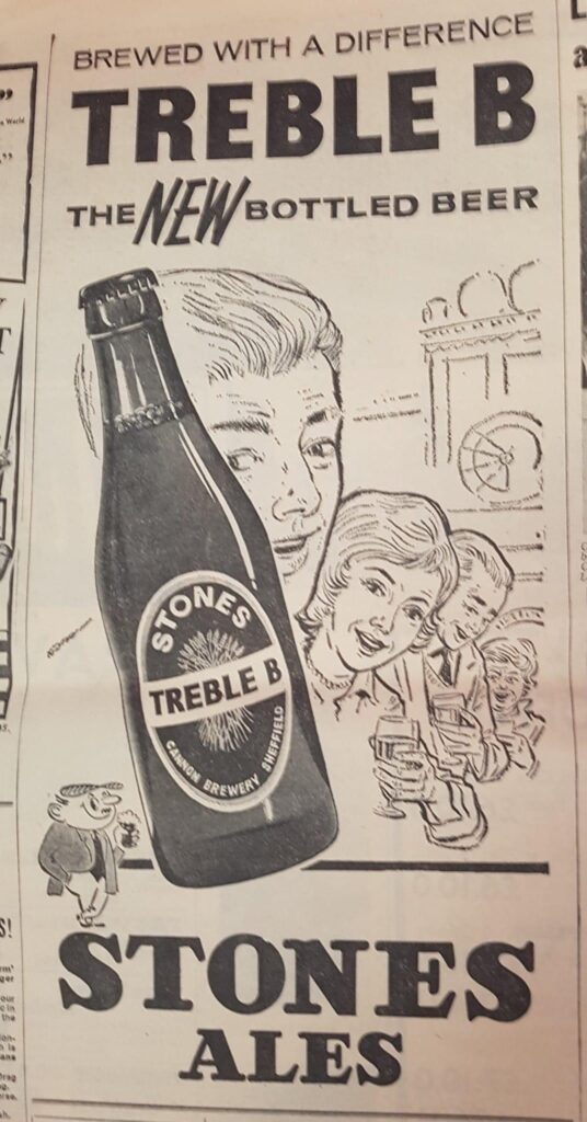 Stones Bitter was introduced by Head Brewer, Edward “Ted” Collins in 1948. It was popular with Sheffield’s steel workers and was originally available across South Yorkshire, Derbyshire, and Nottinghamshire. Increasing demand saw the beer brewed at other Bass breweries from the 1970s onwards. Distribution was extended to the rest of the north of England in 1977, and accompanied by a considerable marketing push, nationwide from 1979.